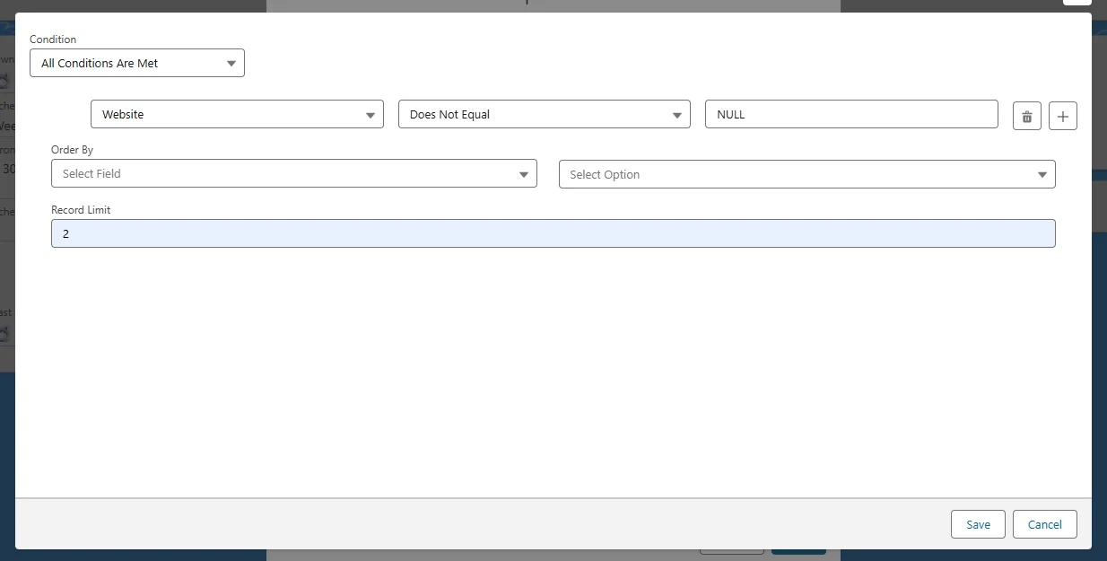 Status = 'Open'). You can use the Query Builder (pencil icon) to create this without writing SOQL. - Record Limit: Default is