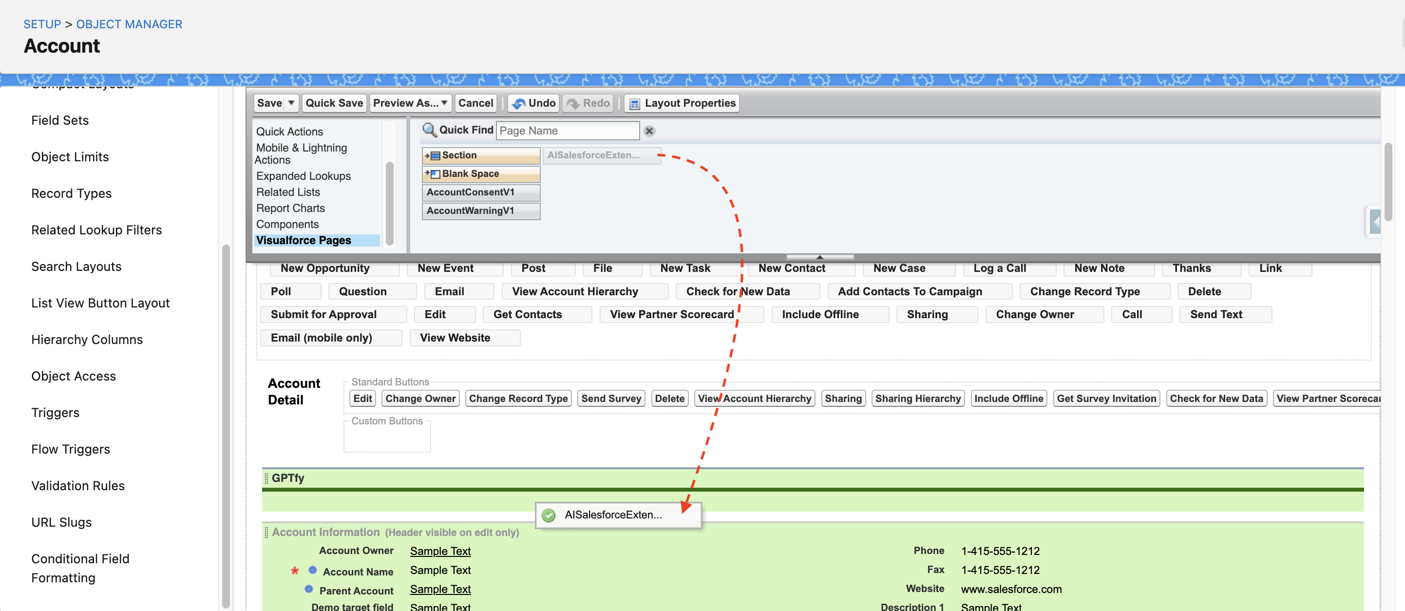 - Drag and drop the ‘AISalesforceExtensionAccountVF’ onto the newly created section.