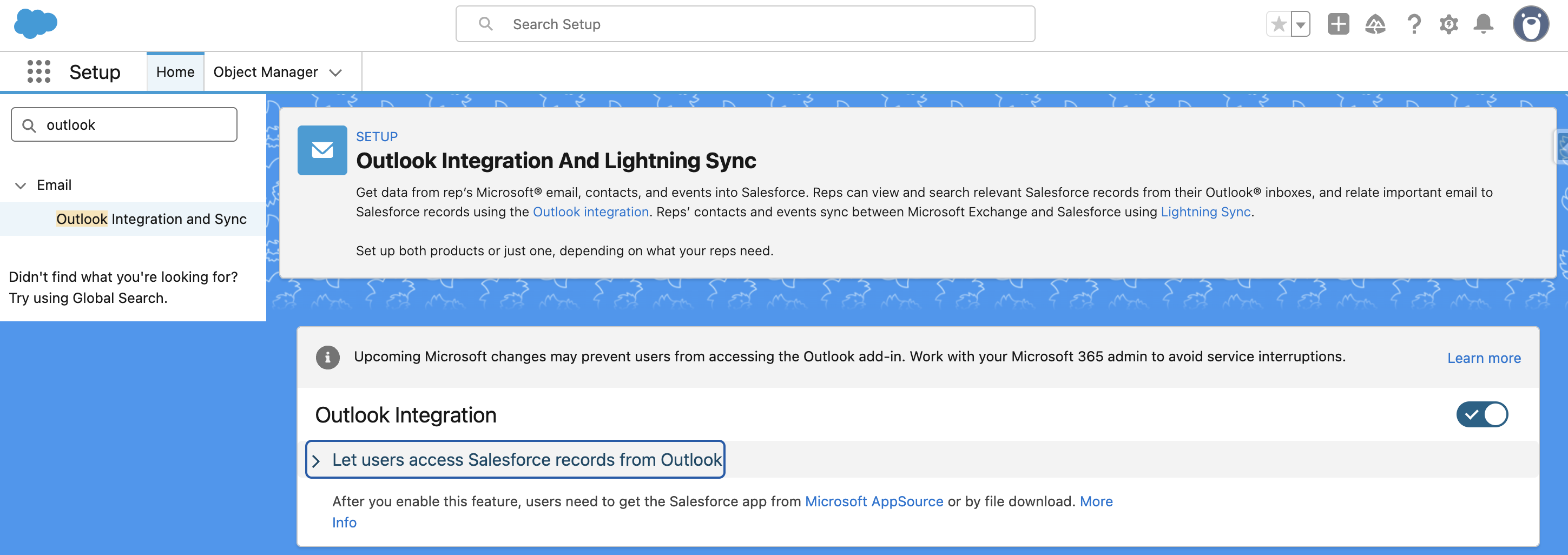 - Go to Setup and search for “Outlook Integration And Lightning Sync.”