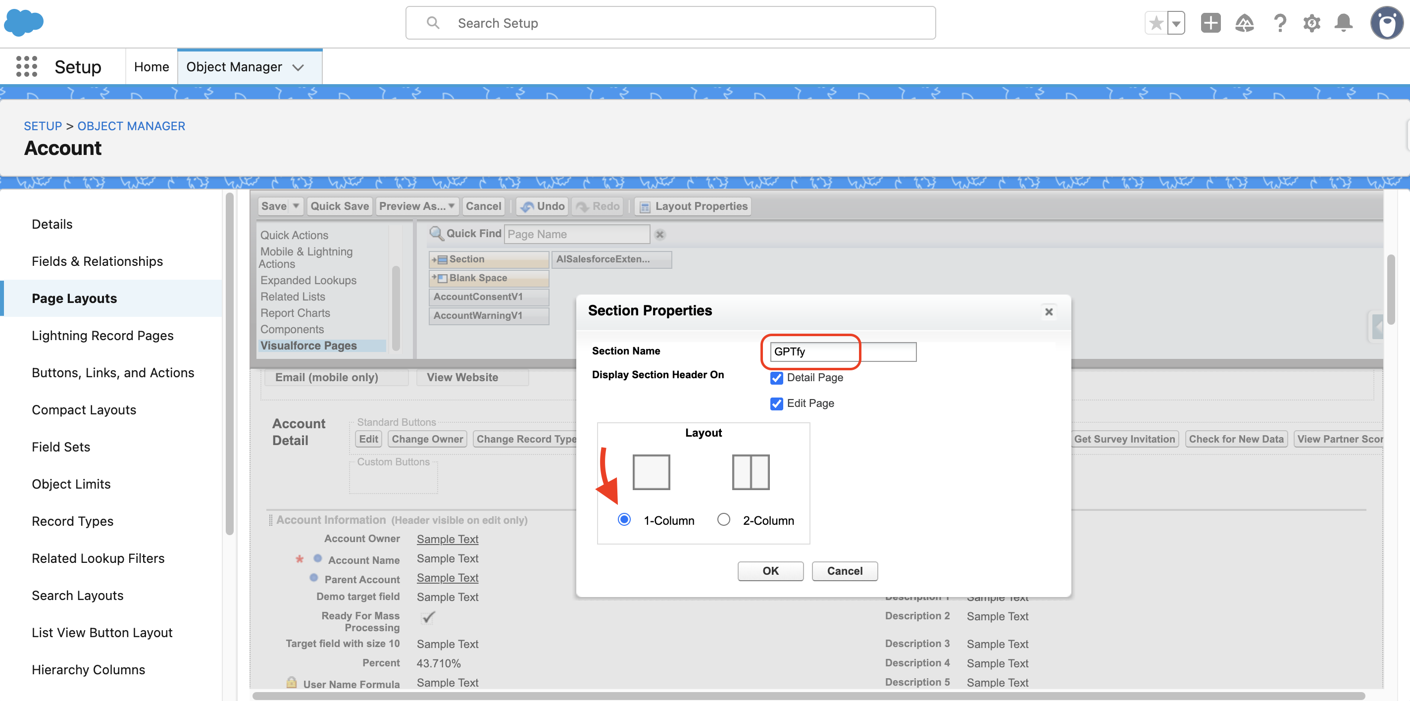 - Drag and drop the ‘AISalesforceExtensionAccountVF’ onto the section that was created earlier.