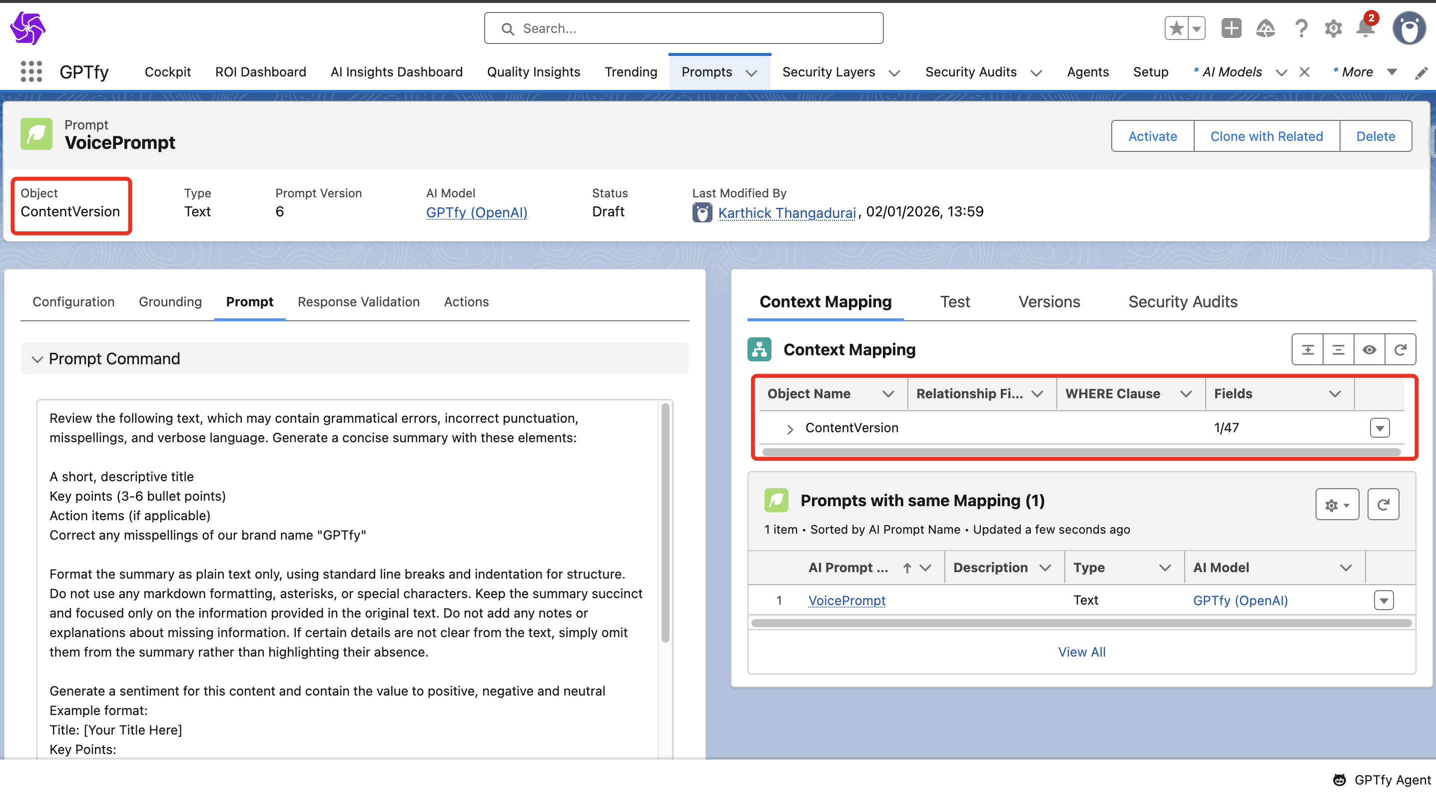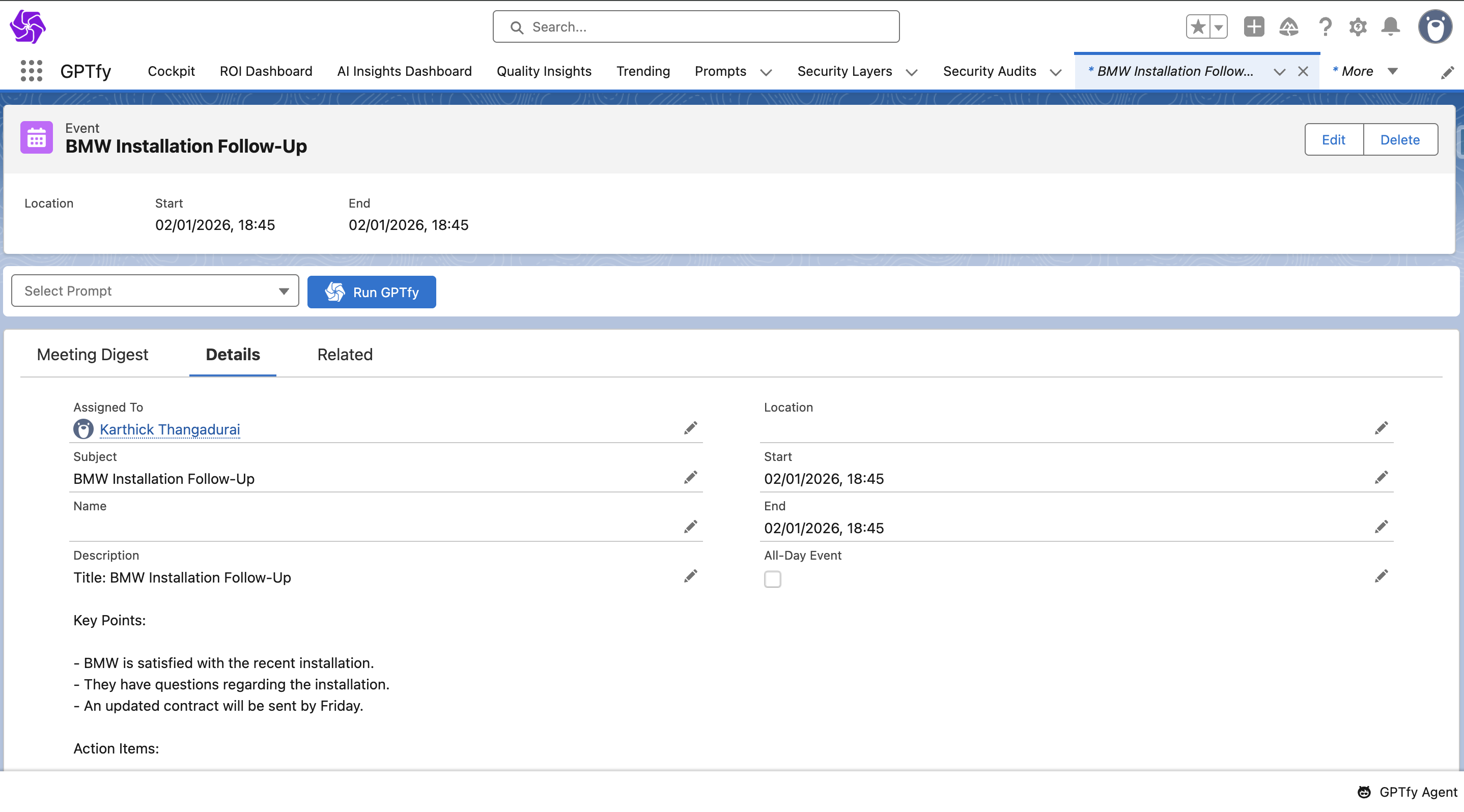 The GPTfy Voice Recorder transforms how your sales and service teams document meetings, calls, or field interactions. By combining voice input with AI-driven transcription and automation, this feature eliminates manual effort and ensures that key details are always captured in Salesforce. With prompt-based workflows and intelligent event creation, GPTfy Voice empowers your team to focus on selling and supporting—while GPTfy takes care of the grunt work.