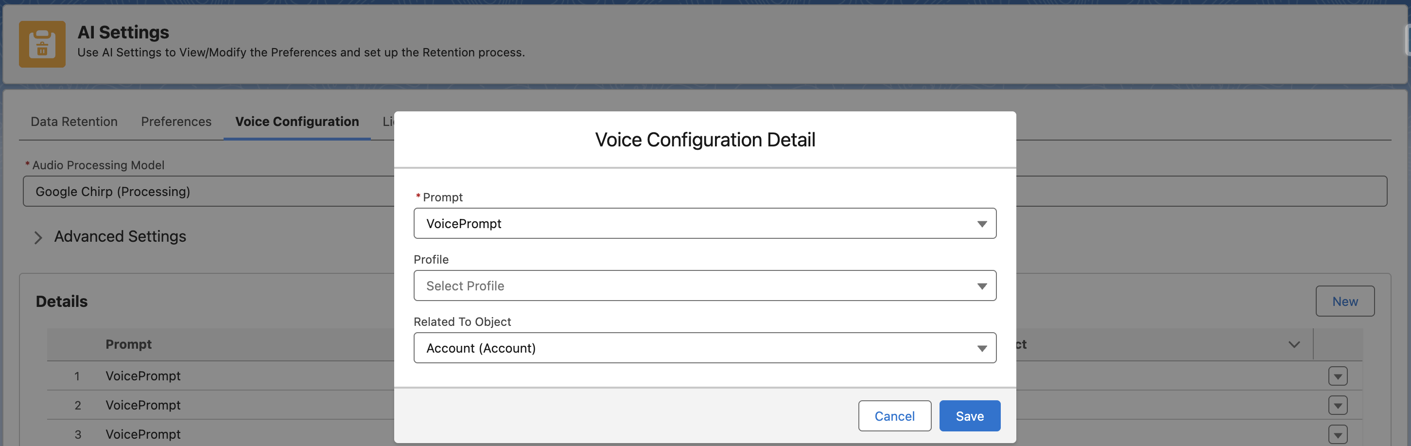 - Add this Prompt in the Voice Configuration Details section and select the Related To Object field from the picklist.