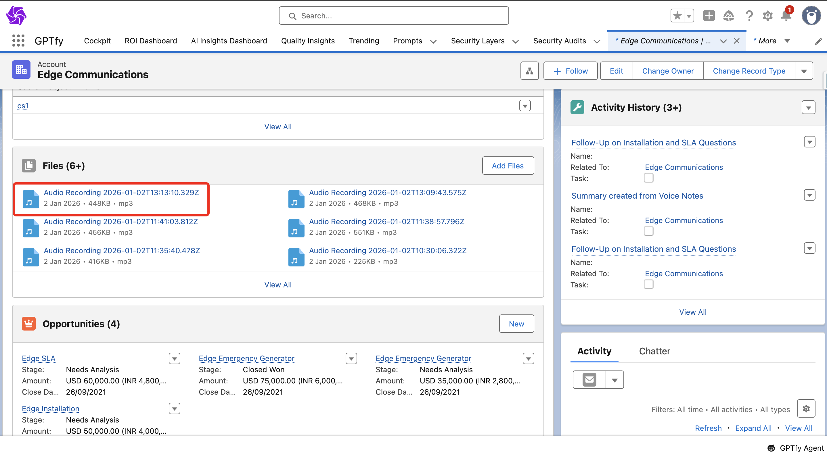 The GPTfy Voice Recorder makes it easy for your sales team to record voice notes directly from Salesforce. These recordings are automatically transcribed using AI and logged to the relevant record saving time and reducing manual effort.