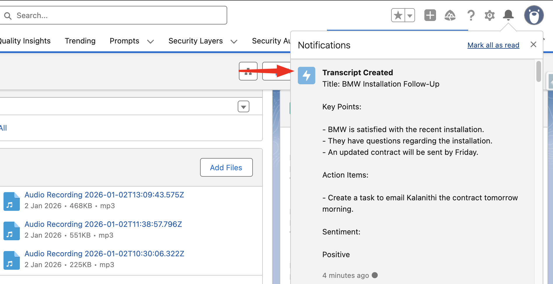 - Clicking the notification redirects the user to the Event Page on the record where the voice was recorded.