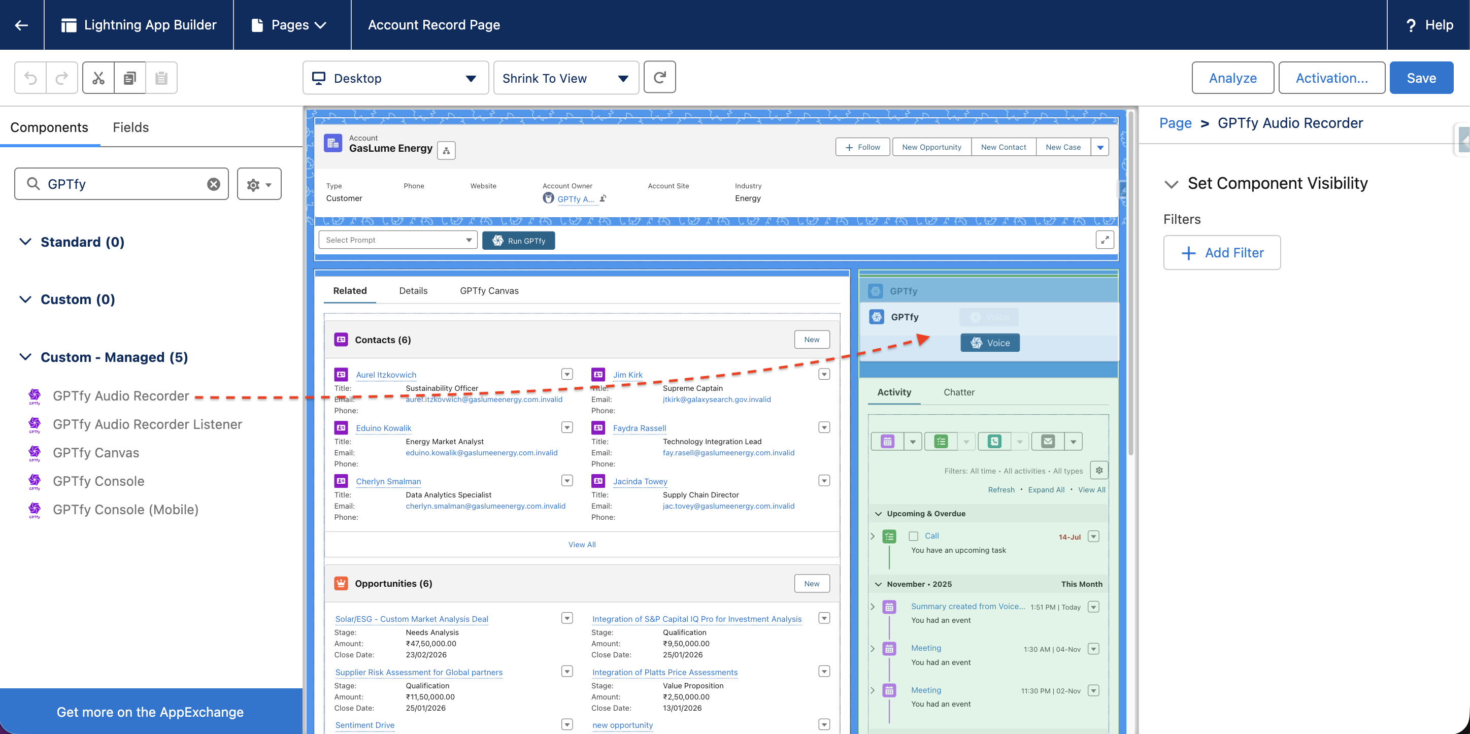 Drag and drop the Voice Recorder Component into the desired location on the Lightning record page.