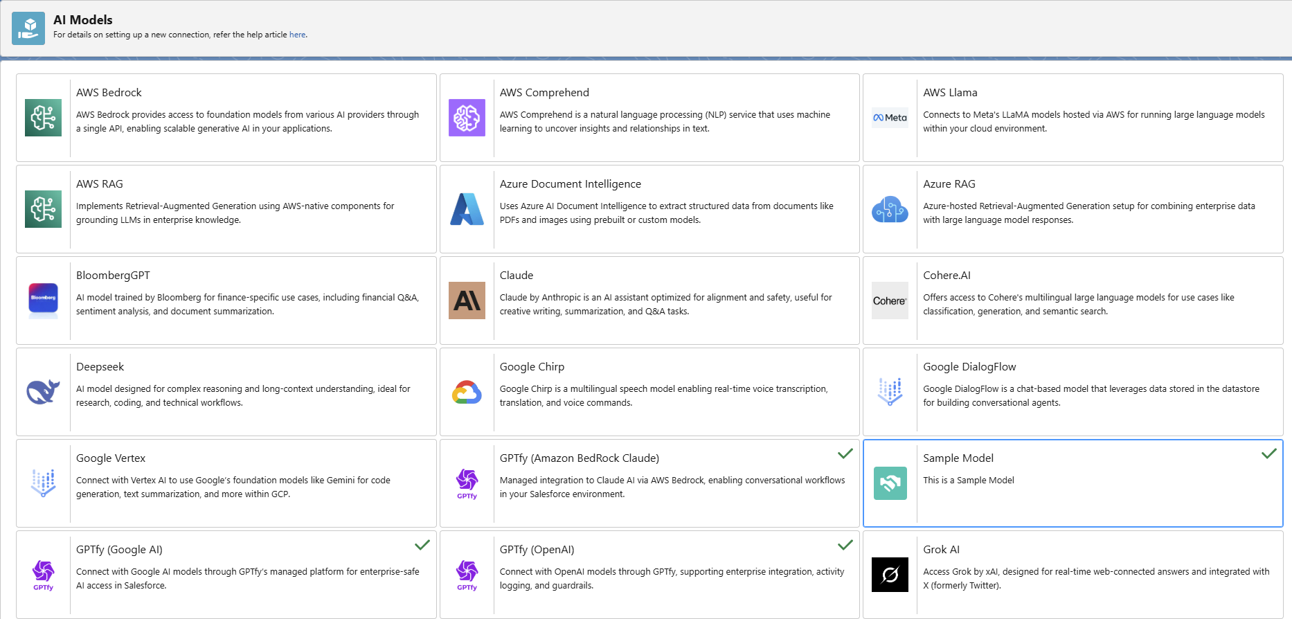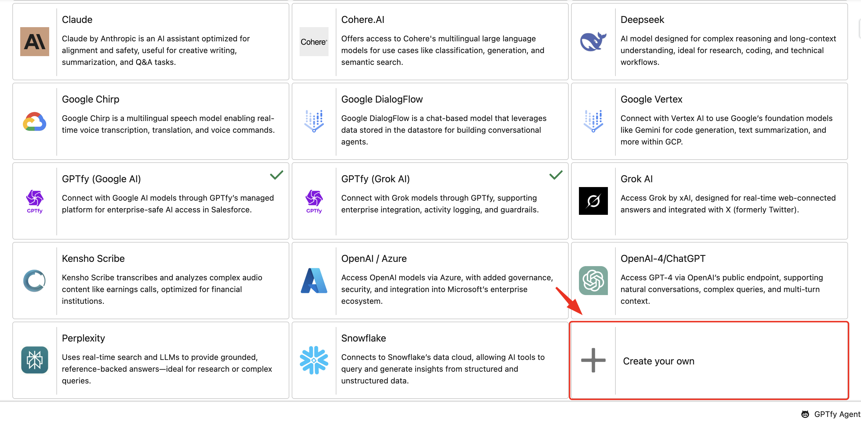 BYOM (Bring Your Own Model) is a GPTfy feature that lets your organization connect AI models of your choice either prepackaged options like Azure OpenAI, Amazon Bedrock, and Google Vertex, or custom models you’ve purchased or host internally—directly within Salesforce.