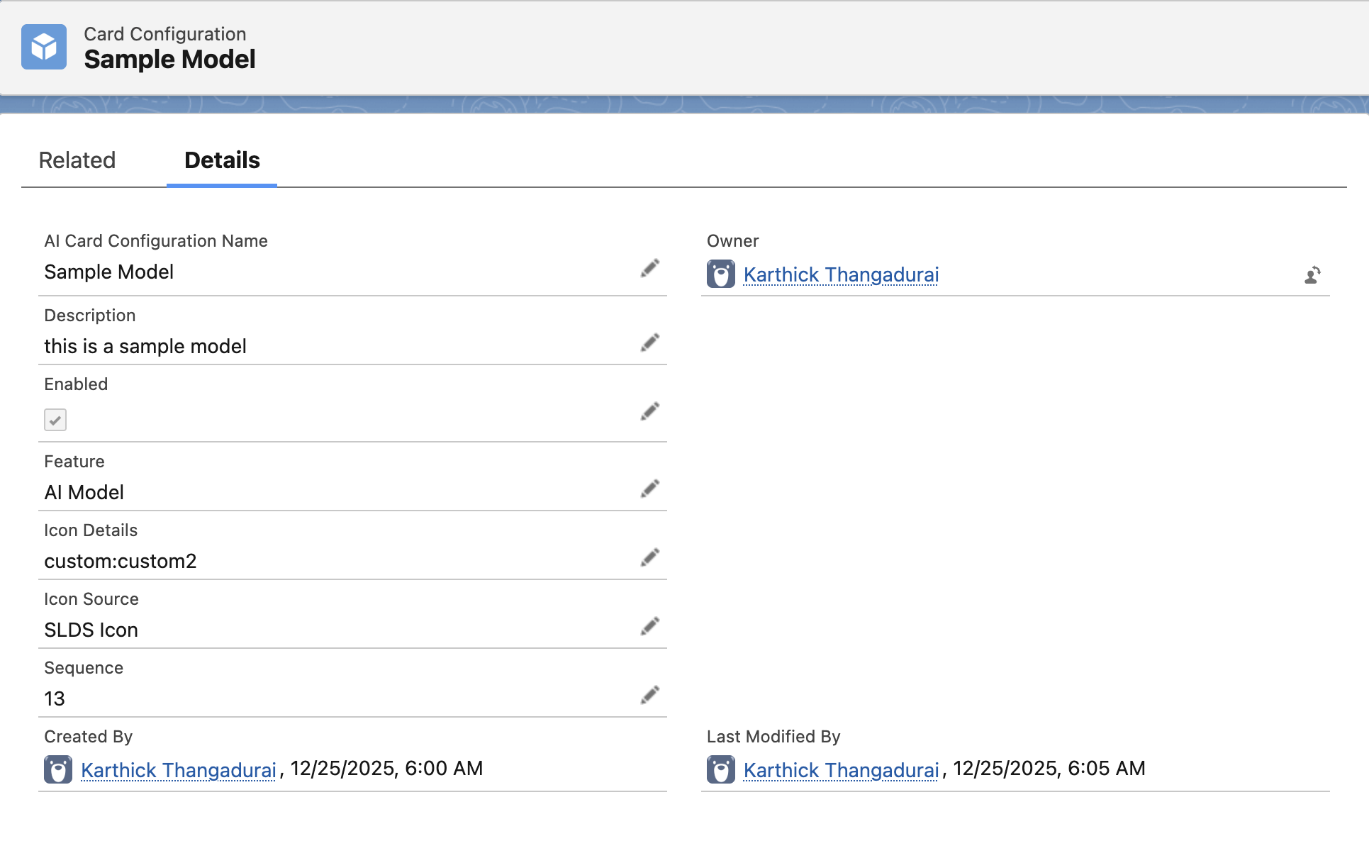 - Static Resource: Upload your model’s logo as a static resource and enter its API name in the Icon Details field.
