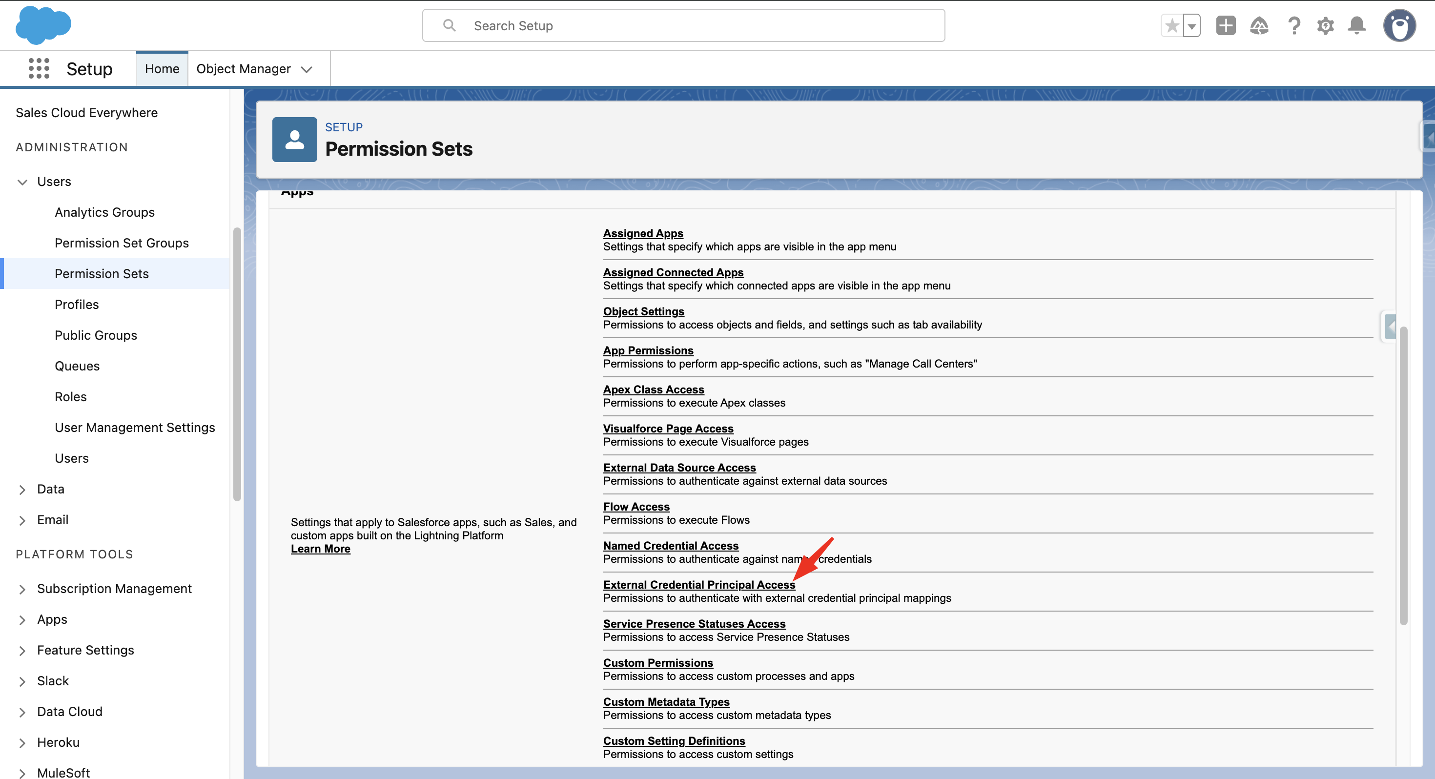 - Scroll down to the Apps section and click on External Credential Principal Access.