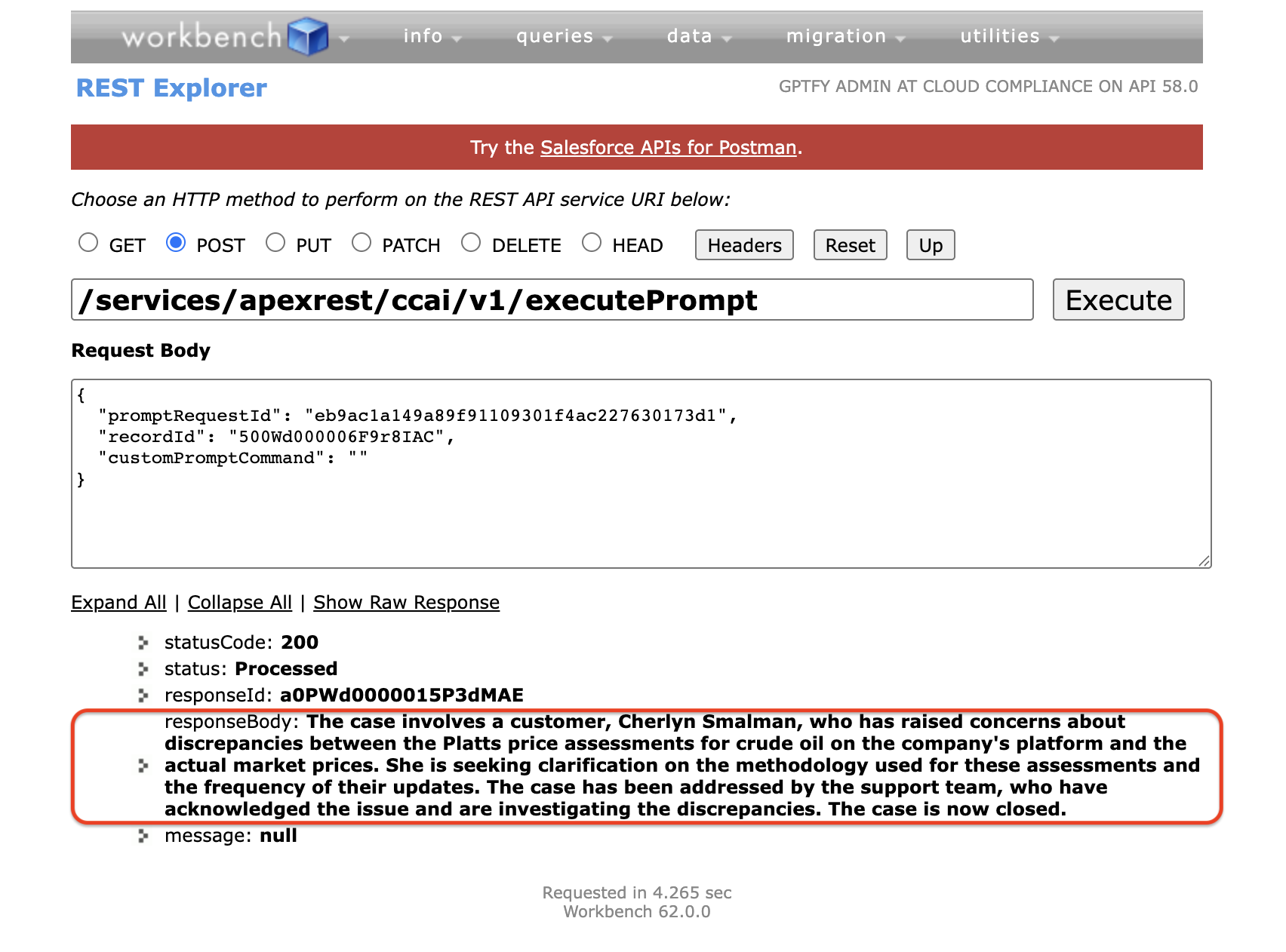 Click the Execute button in the REST Explorer to invoke the GPTfy REST API.