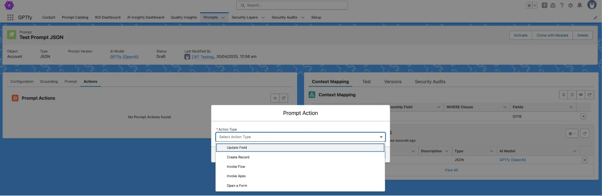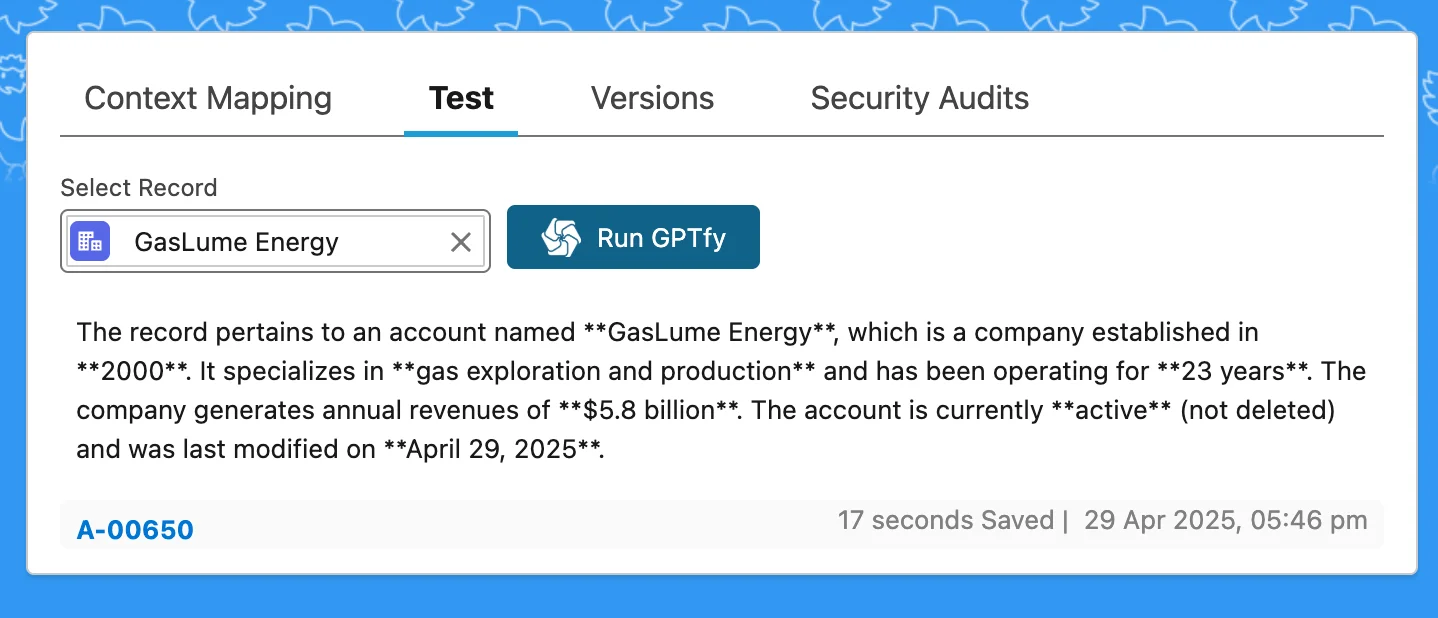 - Test on live Salesforce data (here the record on which the latest prompt was run will be selected automatically)