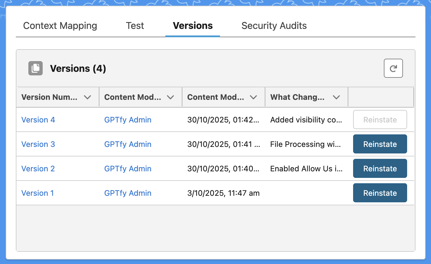 - Use Reinstate to revert to a previous version